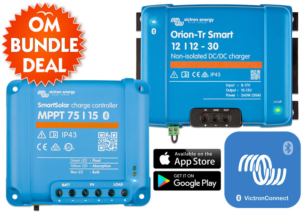 A great entry combo deal at a great price featuring a Victron MPPT 75/15 Bluetooth SmartSolar Charge Controller and 12V 30Amp DC to DC Battery Charger to suit a 12V system with up to a 185w solar panel
