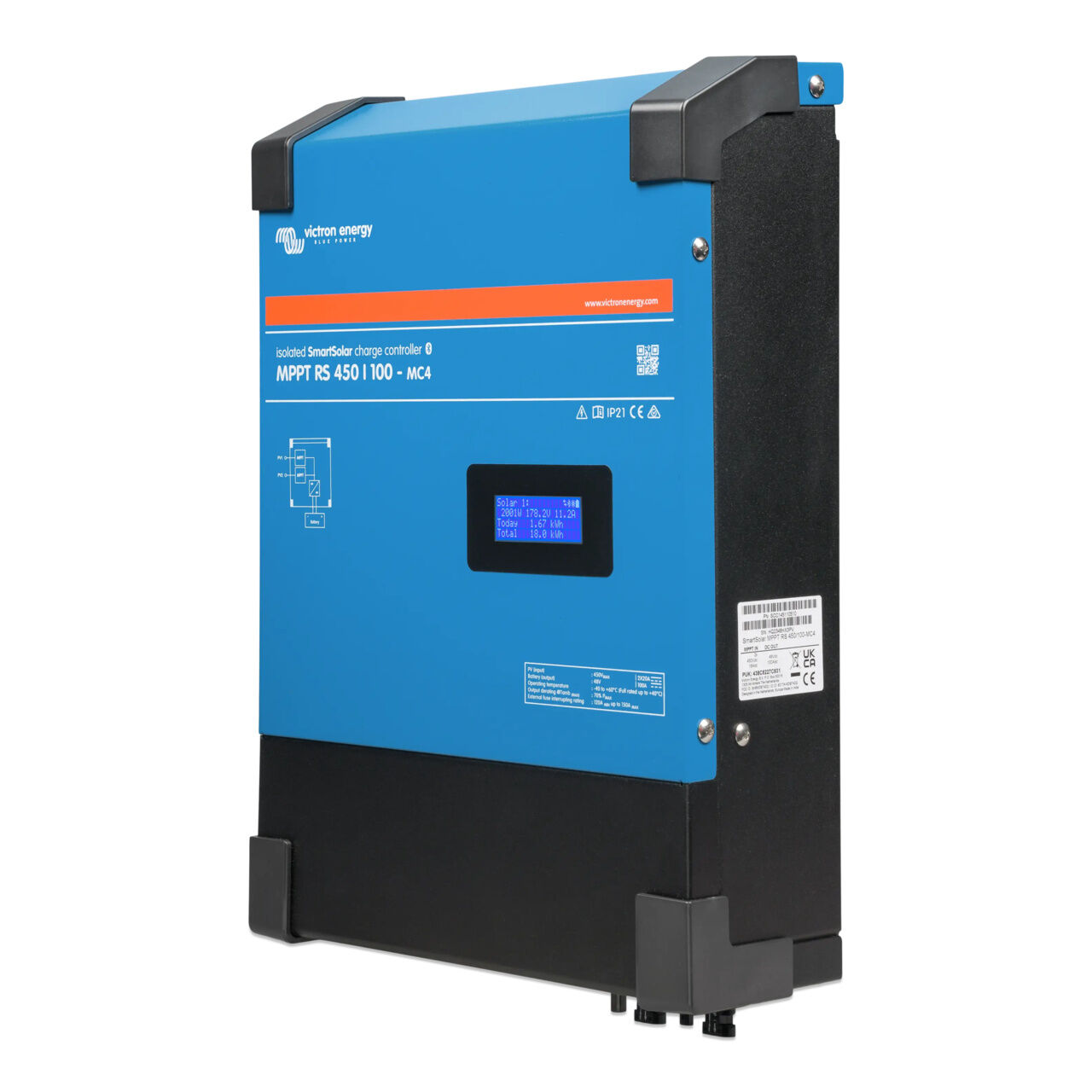 • Integrated display and Bluetooth monitoring: Enables local status viewing and wireless configuration, monitoring, and firmware updates via VictronConnect.