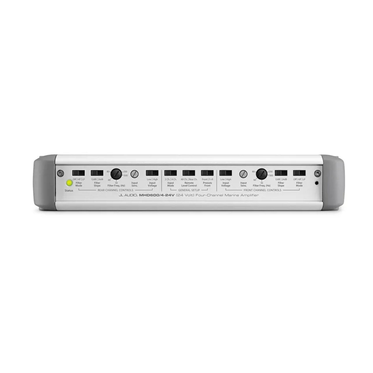 The JL Audio® MHD Series 4-Channel Marine Amplifier delivers 600 W of clean, efficient Class-D power for 24-volt applications. Built to thrive in harsh marine conditions, it provides outstanding sound clarity, flexible channel configuration, and compact construction ideal for boats and off-grid vehicles.